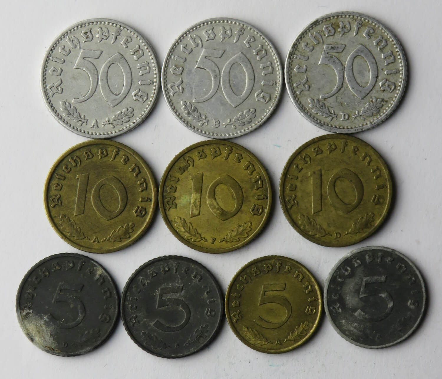 Lot 10 szt.: Niemcy 3 rzesza: 3x 50 fenigów, 3x 10 fenigów, 4x 5 fenigów