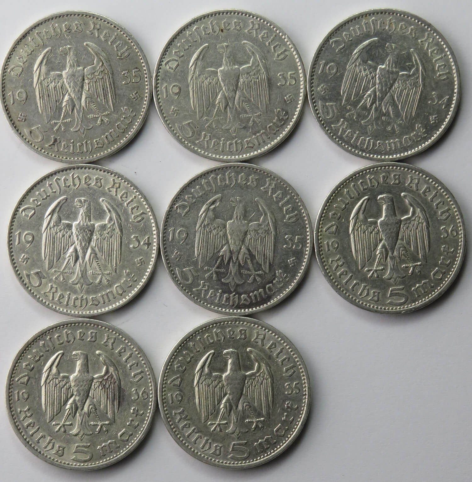 Lot: 8 x 5 marek, Hindenburg + Wieża / Kościół, st. 3/3+