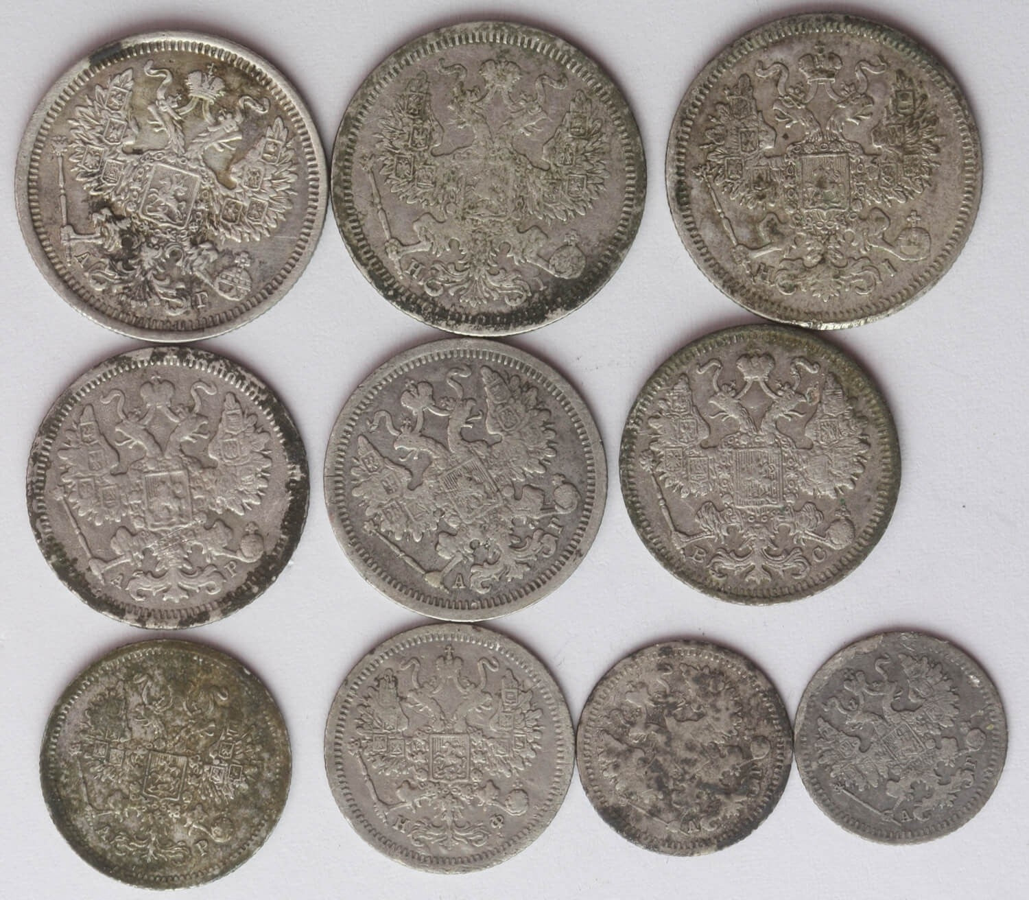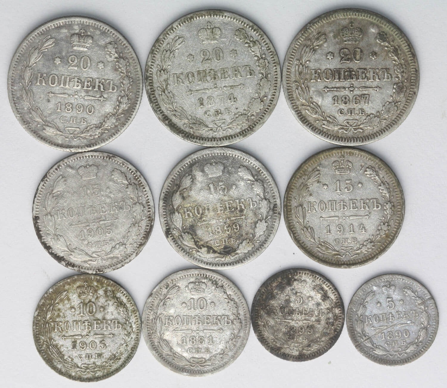 Lot: Rosja carska, 10 x srebrne kopiejki: 3x20k + 3x15k + 2x10k + 2x5k