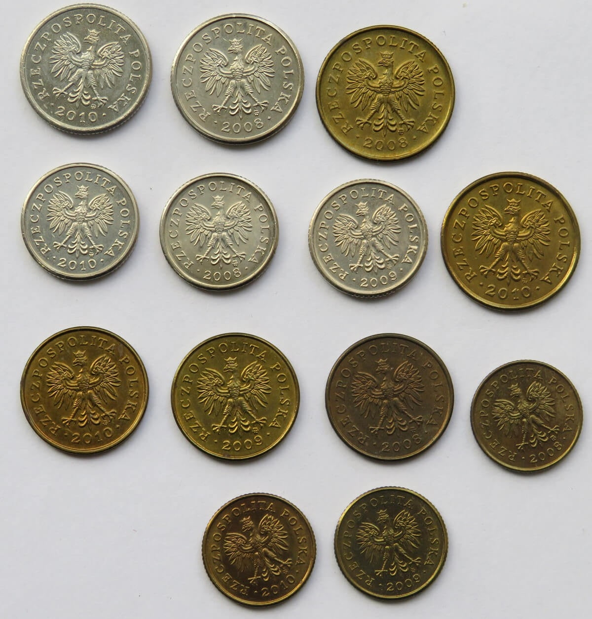 Zestaw 13 monet groszowych z lat 2008-2010 (od 1 do 20 groszy), stany 1 / 1-